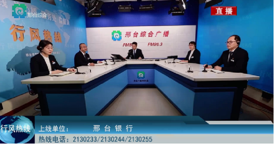??11月29日,副行長馬睿帶領(lǐng)公司金融部、個人金融部和互聯(lián)網(wǎng)銀行部總經(jīng)理走進(jìn)《行風(fēng)熱線》欄目直播間,與市民積極互動,接受社會各界監(jiān)督。